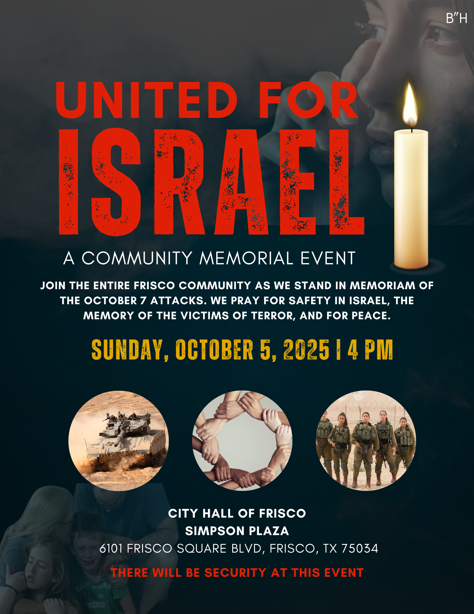 Join the entire Frisco Community as we stand in memoriam of the October 7 attacks. We pray for safety in Israel, the memory of the victims of terror, and for peace.